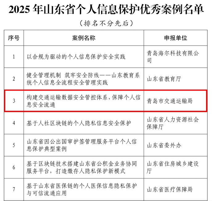 青島交通運(yùn)輸數(shù)據(jù)安全管控體系獲評2025年山東省個人信息保護(hù)優(yōu)秀案例