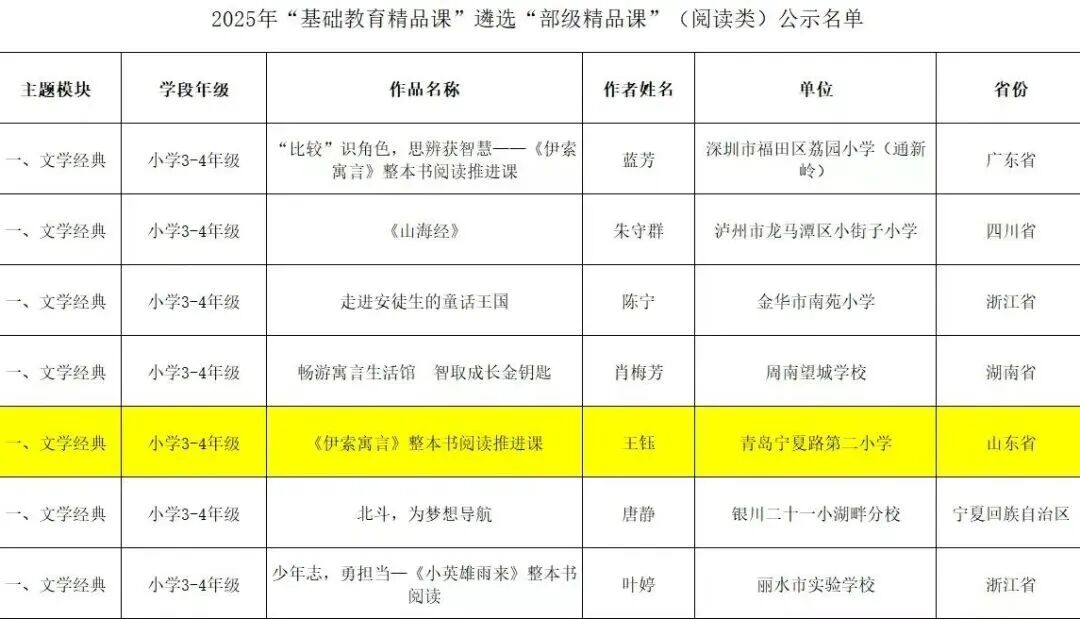 在2025年度教育部“基礎教育精品課”遴選中,由青島寧夏路第二小學語文教師王鈺執(zhí)教的作品《伊索寓言》整本書閱讀推進課,經(jīng)區(qū)、市、省逐級推薦,最終獲評“部級精品課”。