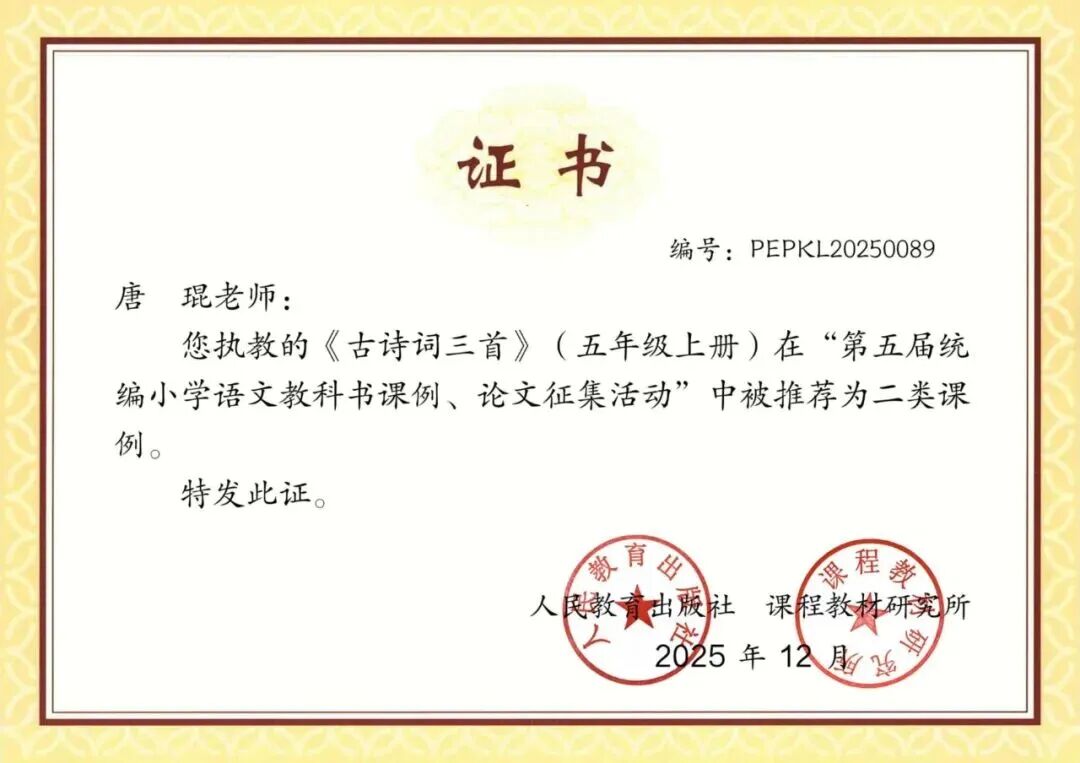 在“第五屆統(tǒng)編小學語文教科書課例、論文征集活動”中,由青島嘉峪關學校語文教師唐琨執(zhí)教的統(tǒng)編版五年級上冊《古詩詞三首》一課,歷經(jīng)區(qū)、市、省三級層層選拔,最終被人民教育出版社、課程教材研究所推薦為國家級二類課例。