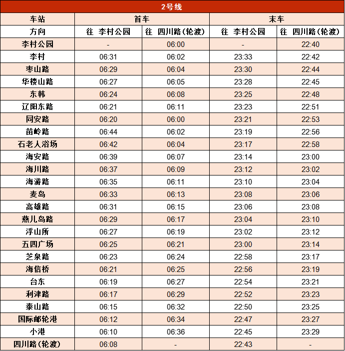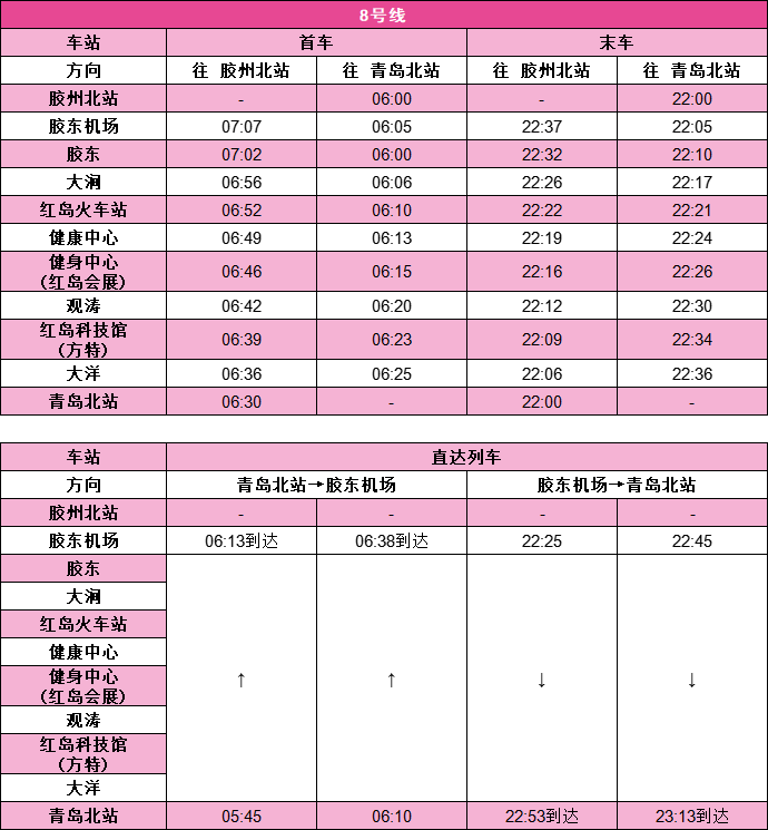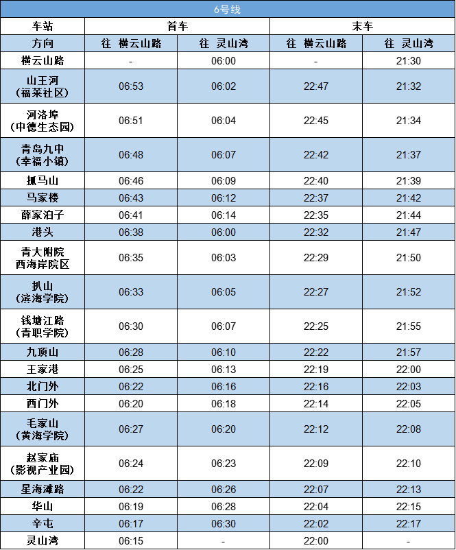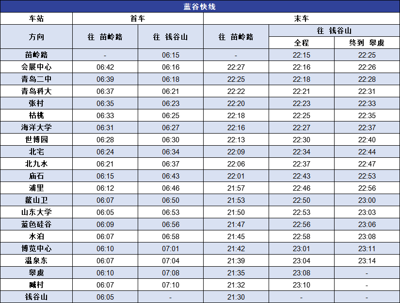 青島地鐵1號線運營時間17小時51分鐘、2號線運營時間17小時34分鐘、3號線運營時間17小時26分鐘、4號線運營時間17小時38分鐘、6號線運營時間16小時50分鐘、8號線運營時間17小時27分鐘,藍谷快線運營時間17小時12分鐘、西海岸快線運營時間17小時14分鐘(各線路首末車時刻見下圖)。