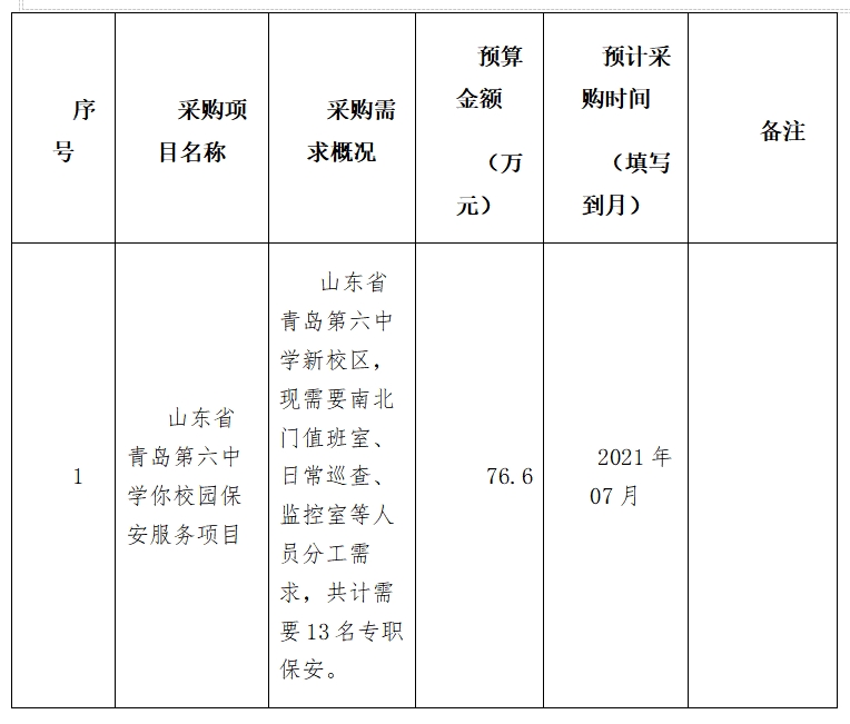 山東省青島第六中學(xué) 2021年06(至)08月政府采購(gòu)意向