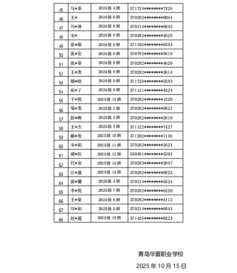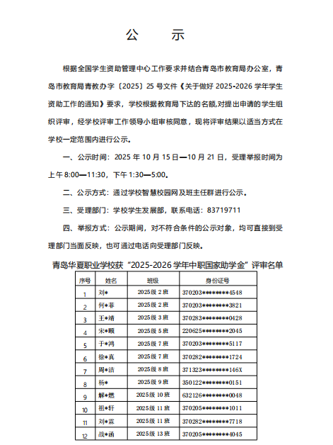 青島華夏職業(yè)學(xué)校2025年中職國家助學(xué)金公示