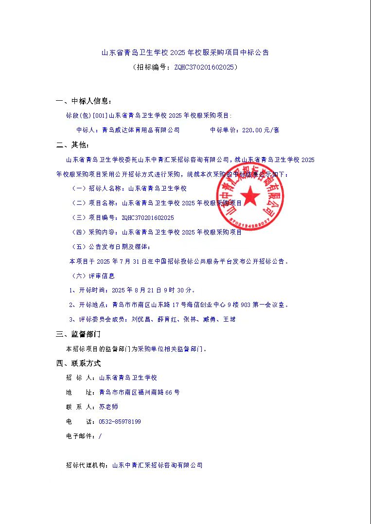 山東省青島衛(wèi)生學校2025年校服采購項目中標公告