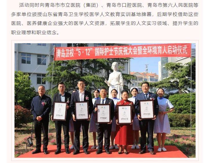 青島市市立醫(yī)院(集團(tuán))、青島市口腔醫(yī)院、青島市第六人民醫(yī)院等多家單位頒授山東省青島衛(wèi)生學(xué)校醫(yī)學(xué)人文教育實(shí)訓(xùn)基地牌匾,后期學(xué)校借助這些醫(yī)院、醫(yī)養(yǎng)健康企業(yè)強(qiáng)大的醫(yī)學(xué)人文資源,拓展學(xué)生的人文實(shí)習(xí)領(lǐng)域、提升學(xué)生的職業(yè)理想和職業(yè)信念。