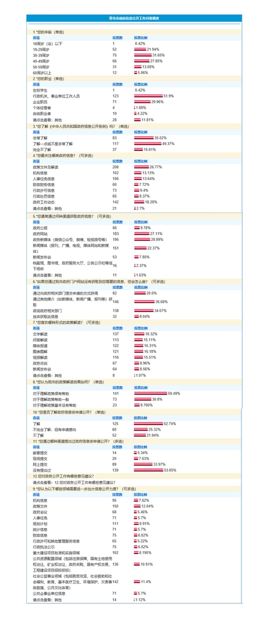 下發(fā)《關(guān)于政府信息公開工作意見建議線上征集活動的通知》,在《中華人民共和國政府信息公開條例》的基礎(chǔ)上,為了更好保障公民、法人和其他組織依法獲取政府信息,設(shè)置“您對政務(wù)公開工作有哪些意見和建議”等10個問題,以問卷調(diào)查形式,開展了為期1個多月的線上民意調(diào)查,深入了解群眾在瀏覽使用我市政府網(wǎng)站與政府信息公開過程中的實際體驗、痛點堵點和意見建議。市級共收回調(diào)查問卷237份??傮w而言,網(wǎng)民對青島市政府網(wǎng)站與政府信息公開工作表示支持和認可,同時也提出“希望持久的辦好”“主動服務(wù)、加強互動,適應(yīng)新形勢,更加人性化”等意見建議,對我們下步工作提出了更高期待和要求。
