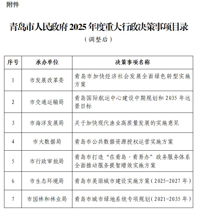附件:青島市人民政府2025年度重大行政決策事項(xiàng)目錄(調(diào)整后)