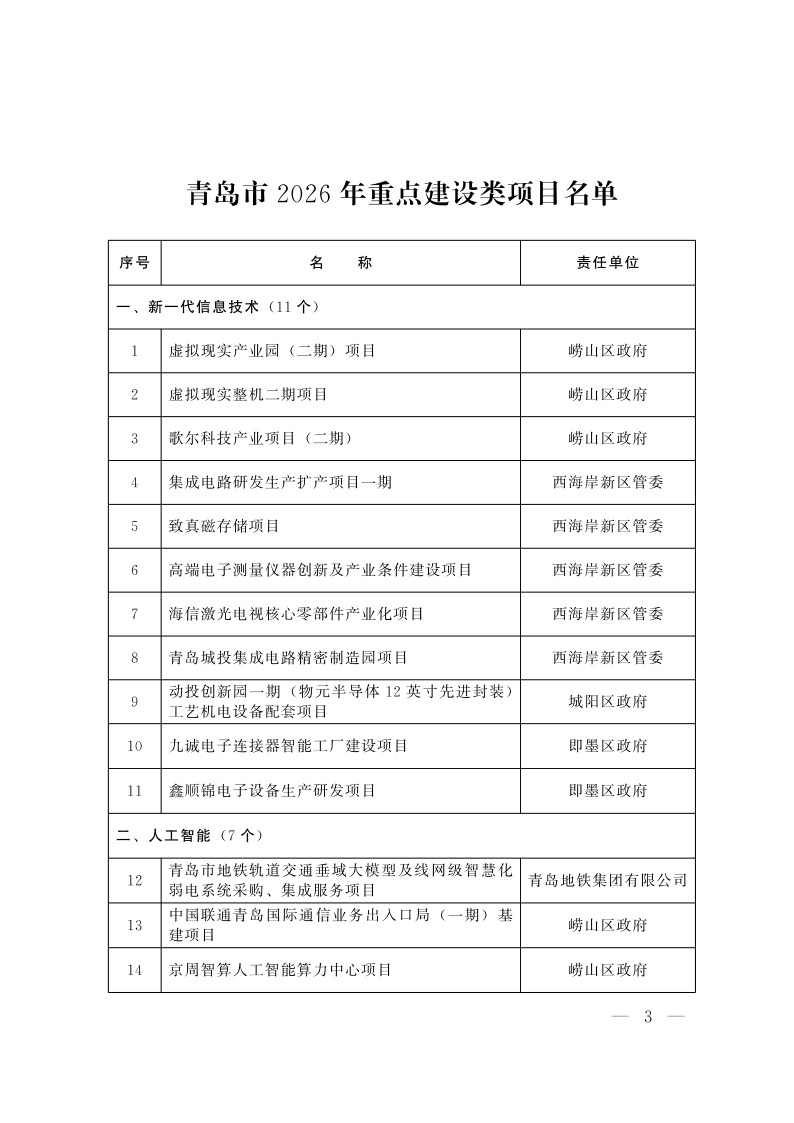 青島市2026年重點(diǎn)項(xiàng)目名單已經(jīng)市政府研究同意,現(xiàn)予以公布,請認(rèn)真貫徹落實(shí)。