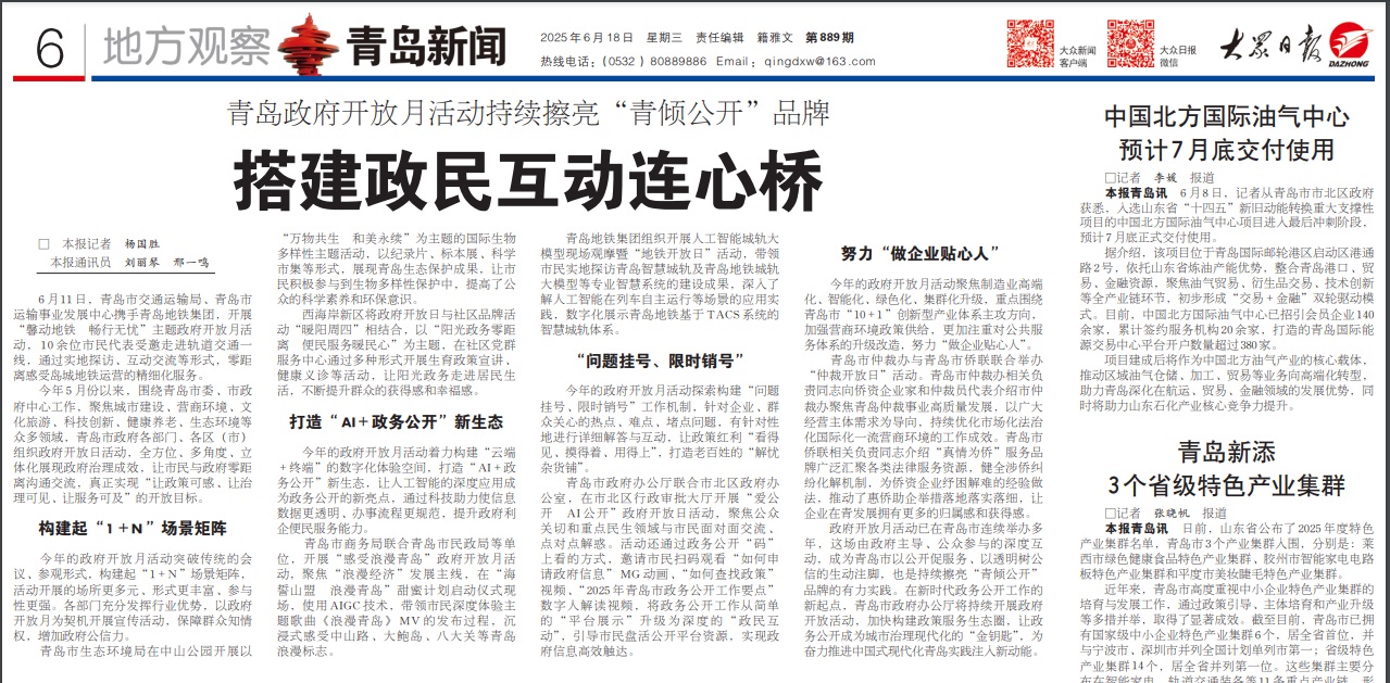 五是開展2025年市政府部門“向市民報告、聽市民意見、請市民評議”活動。36個市政府部門負責人報告了一年來的主要工作,廣大市民通過電視、網絡等平臺收看部門述職報告,3000余名市民代表在線進行評議,活動專題頁面訪問量突破7.7萬人次。新華網、大眾網、青島日報、青島電視臺、藍睛、觀海新聞等省市重點媒體刊發(fā)各類報道超800篇次,“三民”活動影響力持續(xù)擴大。
