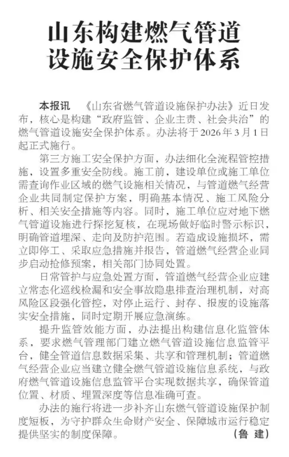 《山東省燃?xì)夤艿涝O(shè)施保護(hù)辦法》近日發(fā)布,核心是構(gòu)建“政府監(jiān)管、企業(yè)主責(zé)、社會共治”的燃?xì)夤艿涝O(shè)施安全保護(hù)體系。辦法將于2026年3月1日起正式施行。