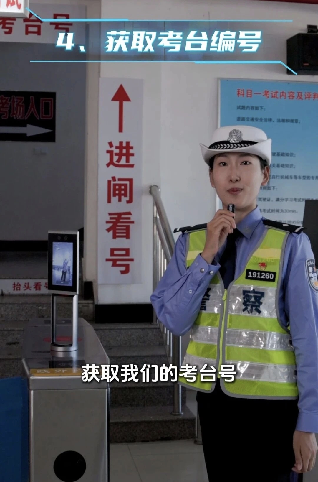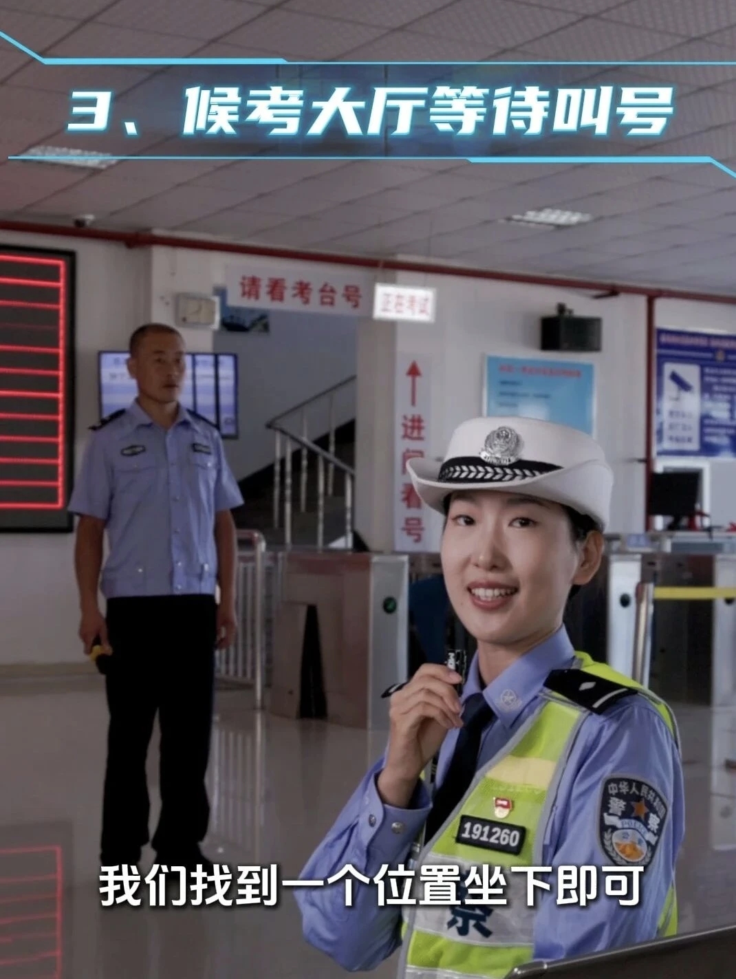 進入候考大廳后找位置坐下,等待大屏幕叫名,認真聽工作人員講解考試要求和注意事項。叫到名字后,拿身份證刷前方的閘機獲取自己的考臺編號。