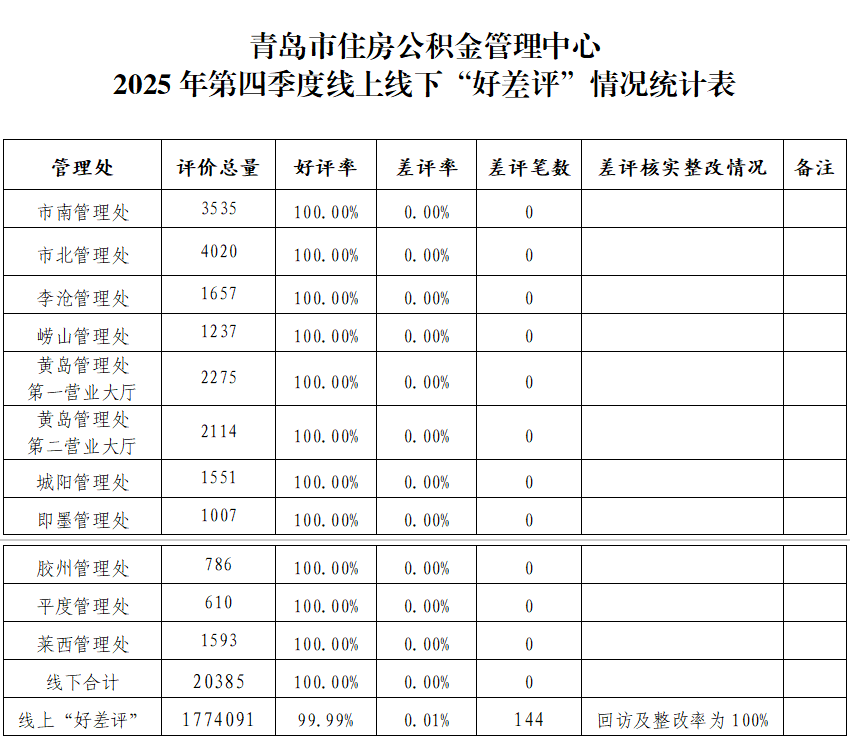 附件:青島市住房公積金管理中心2025年第四季度線上線下“好差評”情況統(tǒng)計表
