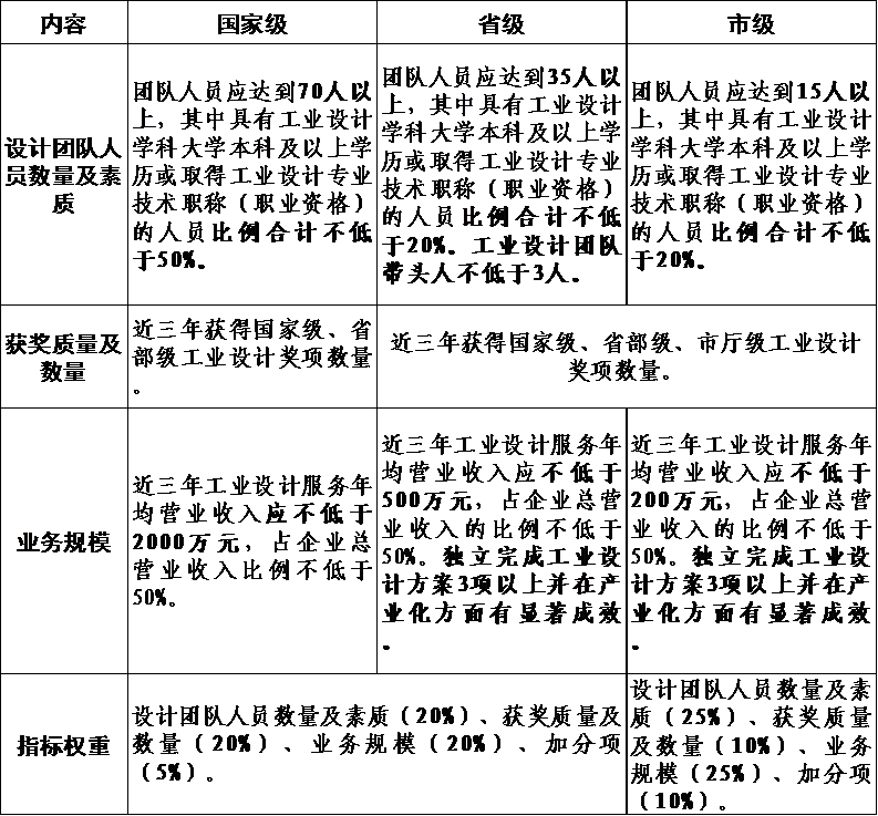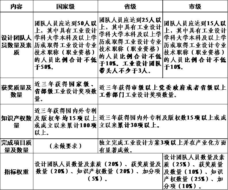 《辦法》附件包括市級(jí)工業(yè)設(shè)計(jì)中心主要評(píng)價(jià)指標(biāo)、市級(jí)工業(yè)設(shè)計(jì)中心申請(qǐng)表、青島市工業(yè)設(shè)計(jì)中心年度情況統(tǒng)計(jì)表。其中,市級(jí)工業(yè)設(shè)計(jì)中心主要評(píng)價(jià)指標(biāo)分為企業(yè)工業(yè)設(shè)計(jì)中心評(píng)價(jià)指標(biāo)和工業(yè)設(shè)計(jì)企業(yè)評(píng)價(jià)指標(biāo),明確了申報(bào)市級(jí)工業(yè)設(shè)計(jì)中心需滿足的基本要求和各項(xiàng)評(píng)價(jià)指標(biāo)所占權(quán)重,并對(duì)評(píng)價(jià)指標(biāo)中各名稱做出了解釋說(shuō)明;市級(jí)工業(yè)設(shè)計(jì)中心申請(qǐng)表和青島市工業(yè)設(shè)計(jì)中心年度情況統(tǒng)計(jì)表分別對(duì)市級(jí)工業(yè)設(shè)計(jì)中心的申請(qǐng)和我市工業(yè)設(shè)計(jì)中心的日常管理做出了規(guī)范。