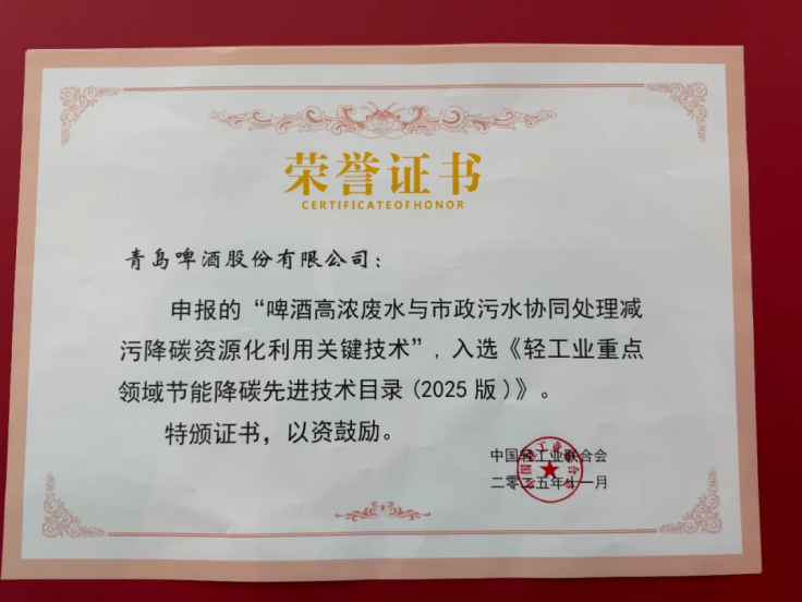 青島啤酒聯(lián)合水務(wù)集團、青島理工大學(xué)研發(fā)的“啤酒高濃廢水與市政污水協(xié)同處理減污降碳資源化利用關(guān)鍵技術(shù)”目前已經(jīng)在青島啤酒38家工廠推廣使用,因節(jié)能減碳效果顯著,對上下游協(xié)同減污減碳作用較大,對啤酒行業(yè)引領(lǐng)示范作用突出,成功入選《輕工業(yè)重點領(lǐng)域節(jié)能降碳先進技術(shù)目錄(2025版)》,全國僅18項,啤酒行業(yè)唯一。