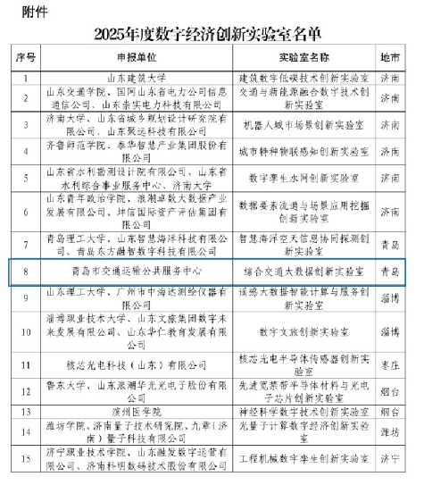 ? ? ? ? 近期,山東省工業(yè)和信息化廳公布了2025年度山東省數(shù)字經(jīng)濟(jì)創(chuàng)新平臺(tái)名單。經(jīng)過單位申報(bào)、行業(yè)主管部門推薦、專家評(píng)審、網(wǎng)上公示等嚴(yán)格程序,由青島市交通運(yùn)輸公共服務(wù)中心牽頭組建的“綜合交通大數(shù)據(jù)創(chuàng)新實(shí)驗(yàn)室”成功入選,獲批成為“2025年度數(shù)字經(jīng)濟(jì)創(chuàng)新實(shí)驗(yàn)室”。