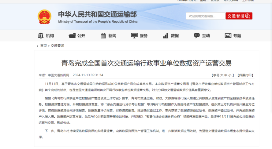 ? ? ? ? 三是以資產(chǎn)化探索破局,激發(fā)數(shù)據(jù)價值“新動能”。會同市財政局、市大數(shù)據(jù)局開創(chuàng)性明確數(shù)據(jù)資產(chǎn)會計確認等審批流程與管理規(guī)范,構(gòu)建符合會計準則要求、具有交通行業(yè)特色的數(shù)據(jù)資產(chǎn)全生命周期數(shù)據(jù)資產(chǎn)管理模式,成功跑出全國交通運輸領(lǐng)域第一單數(shù)據(jù)資產(chǎn)運營交易。健全價值轉(zhuǎn)化機制,聯(lián)合頭部科技企業(yè)、重點科研院所,建立“政產(chǎn)學研用”場景挖掘機制,孵化出“綜合交通運行監(jiān)測動態(tài)看板”等多個創(chuàng)新應(yīng)用,推動“以數(shù)興業(yè)”發(fā)展成果持續(xù)“落地生金”。