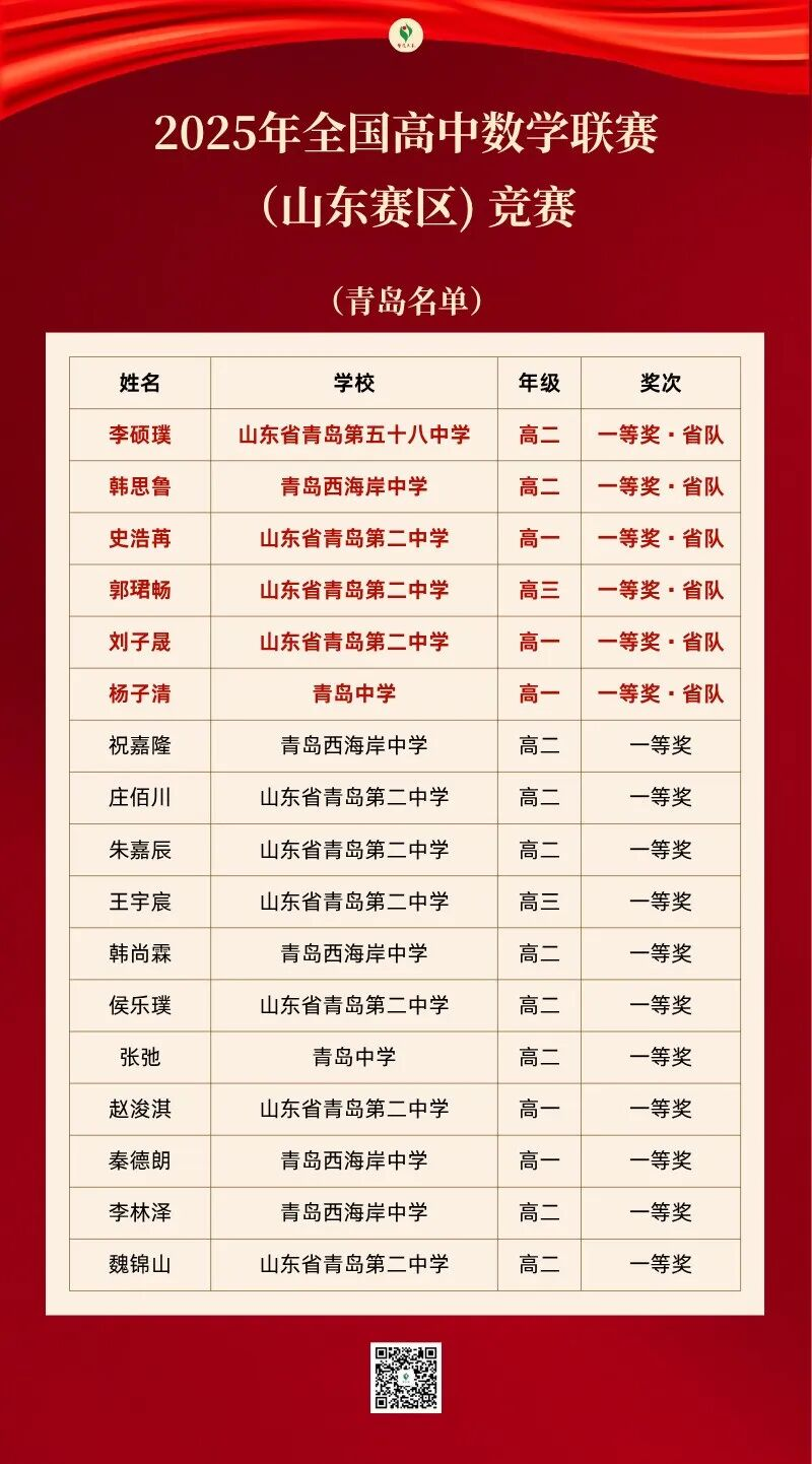 近日,2025年全國高中數(shù)學(xué)聯(lián)賽(山東賽區(qū)) 競賽結(jié)果揭曉,共產(chǎn)生一等獎(jiǎng)90人,其中19人入選省集訓(xùn)隊(duì)。我市共有17名學(xué)生榮獲全國初賽一等獎(jiǎng),占全省一等獎(jiǎng)總?cè)藬?shù)的18.9%;其中6名學(xué)生成功入選省集訓(xùn)隊(duì),占全省集訓(xùn)隊(duì)人數(shù)的31.6%,取得了歷屆省賽最好成績。