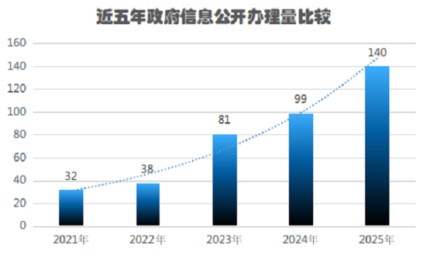 規(guī)范依申請公開全流程辦理,強化服務(wù)理念,注重與申請人溝通,加強與相關(guān)部門協(xié)同聯(lián)動。本年度共辦理政府信息公開申請140件,同比上漲41%。其中予以公開41件,部分公開28件,主動公開1件,工商檔案查詢1件,咨詢1件,需要加工分析1件,屬于其他行政機關(guān)負責(zé)公開67件。所有依申請公開均按程序依法辦理,無行政復(fù)議、行政訴訟敗訴情況。