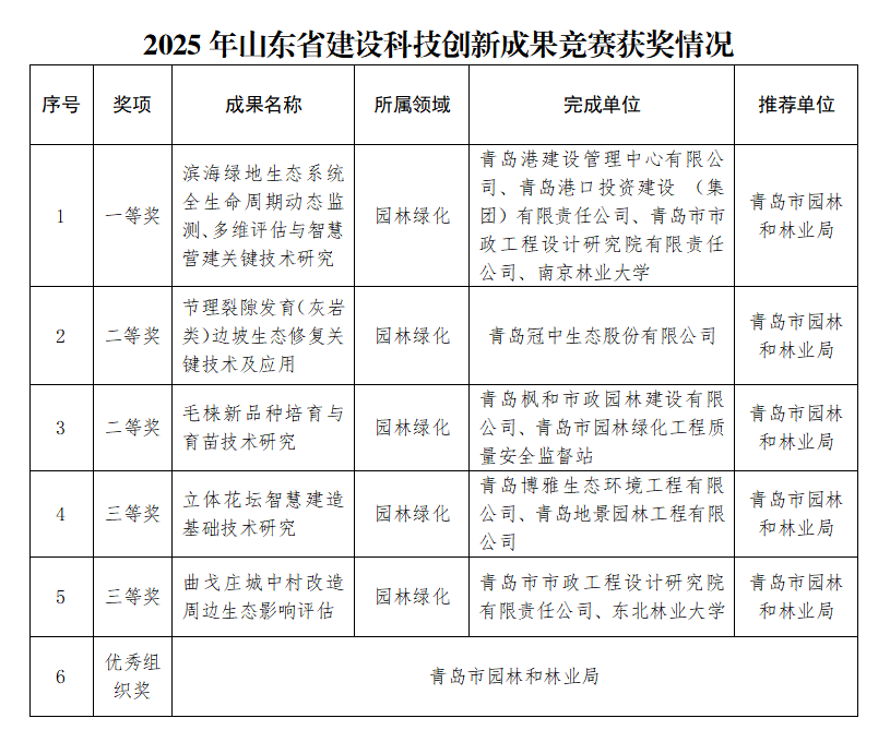 近日,山東省住房和城鄉(xiāng)建設(shè)廳、山東省總工會聯(lián)合公布了2025年山東省建設(shè)科技創(chuàng)新成果競賽結(jié)果,全省累計427項成果獲獎,我局遴選推薦成果獲獎5項。其中1項獲一等獎,2項獲二等獎,2項獲三等獎,同時,青島市園林和林業(yè)局榮獲“優(yōu)秀組織獎”稱號。