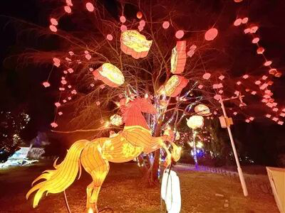 五大賞燈區(qū)各具特色,移步換景:《墨韻天工》區(qū)讓國風(fēng)詩韻與未來機(jī)甲展開對話,傳統(tǒng)風(fēng)骨在科技光影中煥發(fā)新生,《幻萌星河》區(qū)以流光溢彩的卡通燈組,構(gòu)筑浪漫童趣的童話夢境,《韶華織光》區(qū)用光影編織出生機(jī)盎然的春日畫卷,《靈瑞映霞》區(qū)通過哪吒、神鹿等神話意象燈組,演繹祥瑞降臨的瑰麗傳說,《盛世歡歌》區(qū)則以“幸福中國年”等大型打卡燈組,匯聚傳統(tǒng)節(jié)慶元素,燈火璀璨共慶豐年。